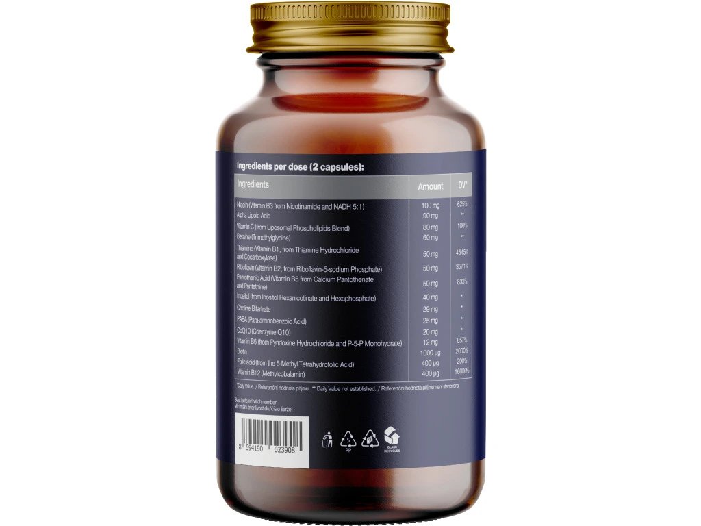Sestava: Vitamin B3 (nikotinamid in nikotinamid adenin dinukleotid hidrid), vitamin B13 (alfa-lipoična kislina), liposomski vitamin C, brezvodni betain, vitamin B1 (tiamin HCL in kokarboksilaza), vitamin B2 (riboflavin in riboflavin-5-fosfat), vitamin B5 (kalcijev pantotenat in pantetin), vitamin B6 (piridoksin in piridoksal-5-fosfat), inozitol (inozitol heksanikotinat in inozitol heksafosfat), vitamin B10 (paraaminobenzojska kislina), holin bitartrat, koencim Q10, vitamin B7 (biotin), vitamin B9 ( 5-metiltetrahidrofolat), vitamin B12 (metilkobalamin), celuloza, rastlinska kapsula na osnovi HPMC. Ne vsebuje balastnih snovi (E).