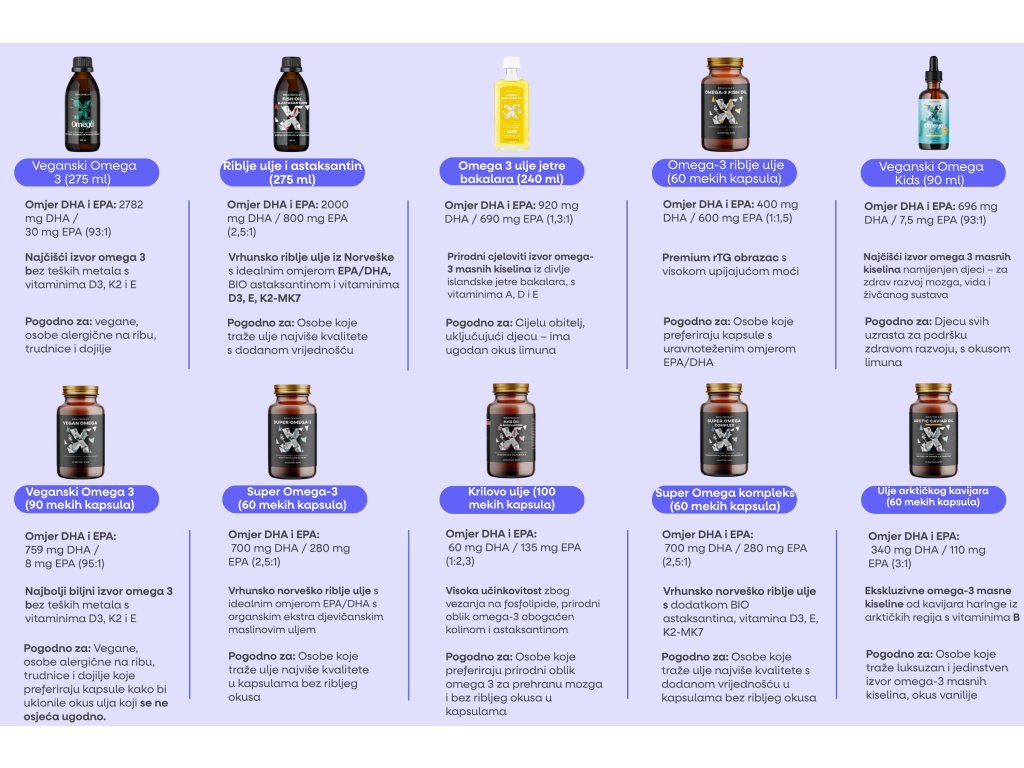 Razmerje med EPA (eikozapentaenojsko kislino) in DHA (dokozaheksaenojsko kislino) igra ključno vlogo pri učinkovitosti prehranskih dopolnil z omega-3 . Vsaka od teh maščobnih kislin ima specifične biološke učinke, zato je njihovo ravnovesje zelo pomembno. DHA prispeva k ohranjanju normalnega delovanja možganov in vida , medtem ko EPA in DHA skupaj prispevata k normalnemu delovanju srca.