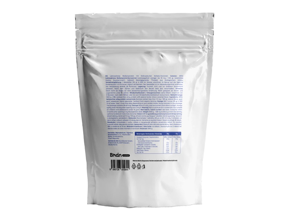 BrainMax beljakovine brez laktoze, arašidovo maslo, čokolada in karamela, 1000 g Mikrofiltrirane nedenaturirane beljakovine iz mleka krav pašnikov, 28 obrokov, prehransko dopolnilo