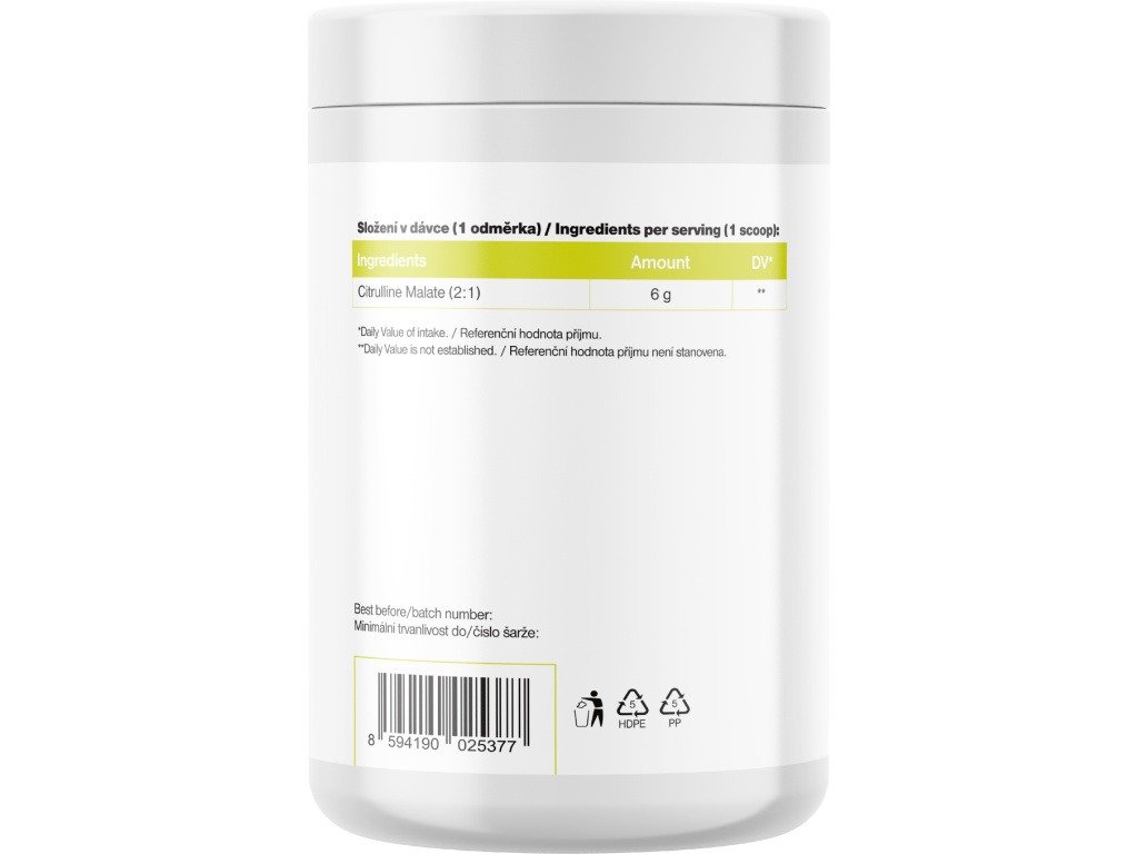 Citrulin kot aminokislina in malat kot jabolčna kislina sta edinstvena kombinacija, katere rezultate boste občutili pri povečanju vzdržljivosti in moči [1,3] ali izboljšanju regeneracije [2]. Malat sodeluje pri povečanju celične energije ATP (zadnja faza Krebsovega cikla) in citrulin zmanjšuje tvorbo mlečne kisline in amoniaka, s čimer podaljšuje trajanje zmogljivosti ter obenem zmanjšuje utrujenost in bolečino v mišicah. Citrulin se v telesu pretvori v drugo aminokislino arginin, ki sodeluje pri produkciji dušikovega oksida, torej NO. Dušikov oksid oziroma NO igra ključno vlogo pri vazodilataciji (širjenju žil). Zaradi višjega pretoka krvi v žilah so mišice bolje prekrvavljene, torej tudi napolnjene, kar prinaša tudi boljšo dostavo hranil v mišice. Zaradi jabolčne kisline, ki jo citrulin malat vsebuje, je okus citrulina precej kisel, zato priporočamo, da ga zmešate z džusom, smoothiejem ali kokosovo vodo, ki omili kislost.