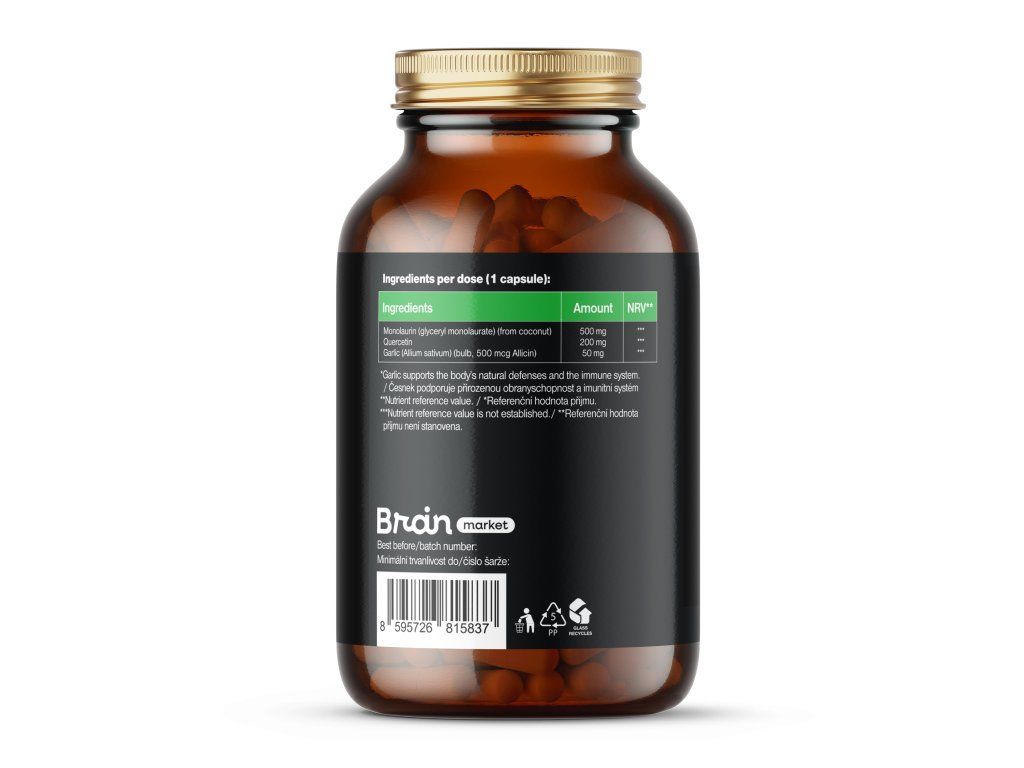 Sestava v odmerku (1 kapsula): monolaurín (glycerol monolaurát) (z kokosa) (500 mg, NRV*), kvercetín (200 mg, NRV*), cesnak (Allium sativum) (cibuľa, 500 mcg Allicin) (50 mg, NRV*), oxid kremičitý. rastlinná kapsula na báze HPMC.