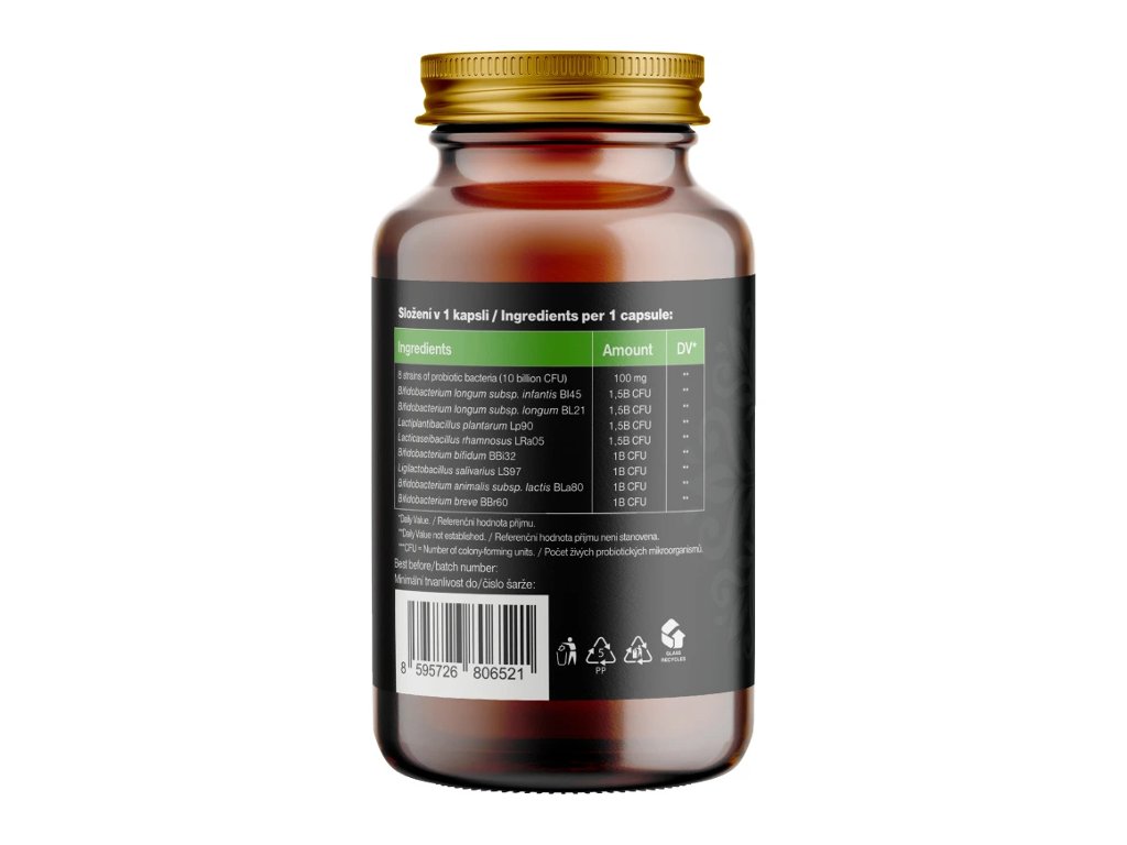 Sestava: 8 sev probiotičnih bakterij (10 milijard CFU): Bifidobacterium longum subsp. infantis Bl45, Bifidobacterium longum subsp. longum BL21, Lactiplantibacillus plantarum Lp90, Lacticaseibacillus rhamnosus LRa05, Bifidobacterium bifidum BBi32, Ligilactobacillus salivarius LS97, Bifidobacterium animalis subsp. lactis BLa80, Bifidobacterium breve BBr60. Enterično obložena kapsula izdelana iz 85 % hidroksipropil metilceluloze (HPMC), pektina in prečiščene vode. Ne vsebuje laktoze.