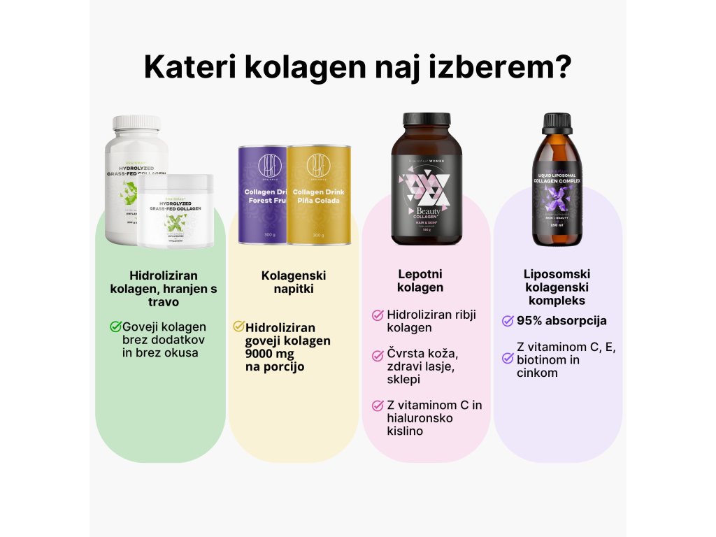 Kolagen je najbolj zastopana beljakovina v našem telesu. Je del sklepov, mišic, kit, vezi, pa tudi kože. Kolagen je tudi del prebavnega sistema in krvnih žil. Proizvodnja kolagena v našem telesu se s starostjo zmanjšuje, zato je priporočljivo, da to beljakovino dopolnite. Hidroliziran kolagen je bolj biološko dostopen, saj gre skozi proces hidrolize, ko se posamezne beljakovine "razbijejo" na manjše kolagenske peptide, ki jih celica zlahka sprejme.