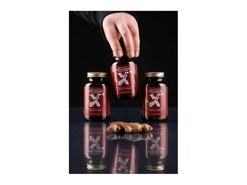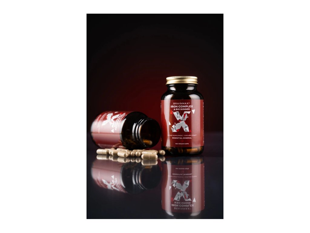 BrainMax Iron Complex, železov bisglicinat, 25 mg, 100 rastlinskih kapsul Železo v kelirani obliki z vitamini C, B9 in B12, novo z BIO ingverjem, prehransko dopolnilo