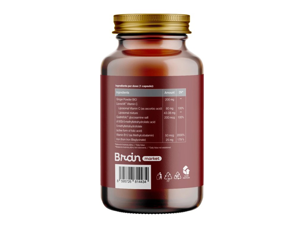 Sestava: Bio ingver, liposomalni vitamin C (askorbinska kislina, liposomalna mešanica iz sončničnega lecitina), Quatrefolic® glukozaminska sol kisline (6S)-5-metiltetrahidrofolske, ki vsebuje 5-metiltetrahidrofolat (aktivna oblika folne kisline), vitamin B12 (metilkobalamin), bisglicinat železa. Rastlinska kapsula na osnovi HPMC. Ne vsebuje nobenih dodatkov (E-jev) ali glutena.