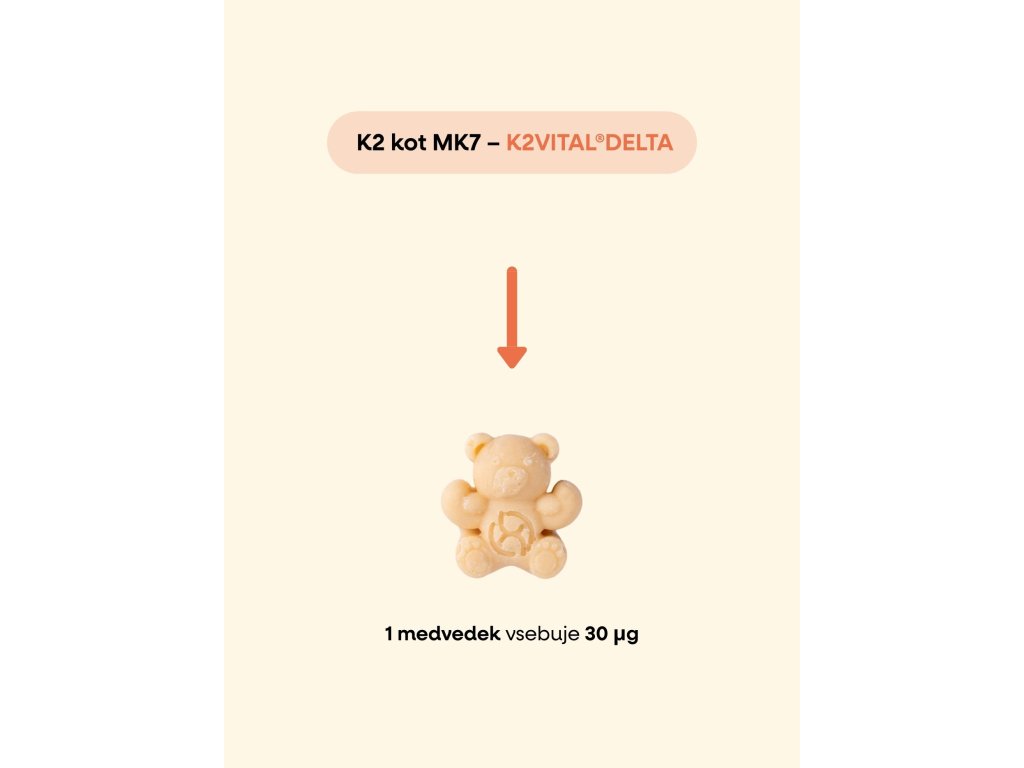 Vsak medvedek, ki je več kot 97 % v BIO kakovosti, ponuja premišljen kompleks vitaminov in cinka, ki podpira otroke na vsakem njihovem koraku. Zaradi kakovostnih oblik vitaminov, na čelu s K2Vital®Delta, in mineralov se hranila dobro izkoristijo in izdelek tako ustreza visokim zahtevam linije KIDS. Okus bele čokolade, kakovostne oblike in funkcionalnost ustvarjajo edinstveno kombinacijo, ki združuje strokovno sestavljeno sestavo s prijetno obliko uživanja. Otroci tako pridobijo vsakodnevno podporo imunosti1 in energije1, ki jo zlahka sprejmejo in ki jo starši lahko z zaupanjem vključijo v vsakodnevno rutino.