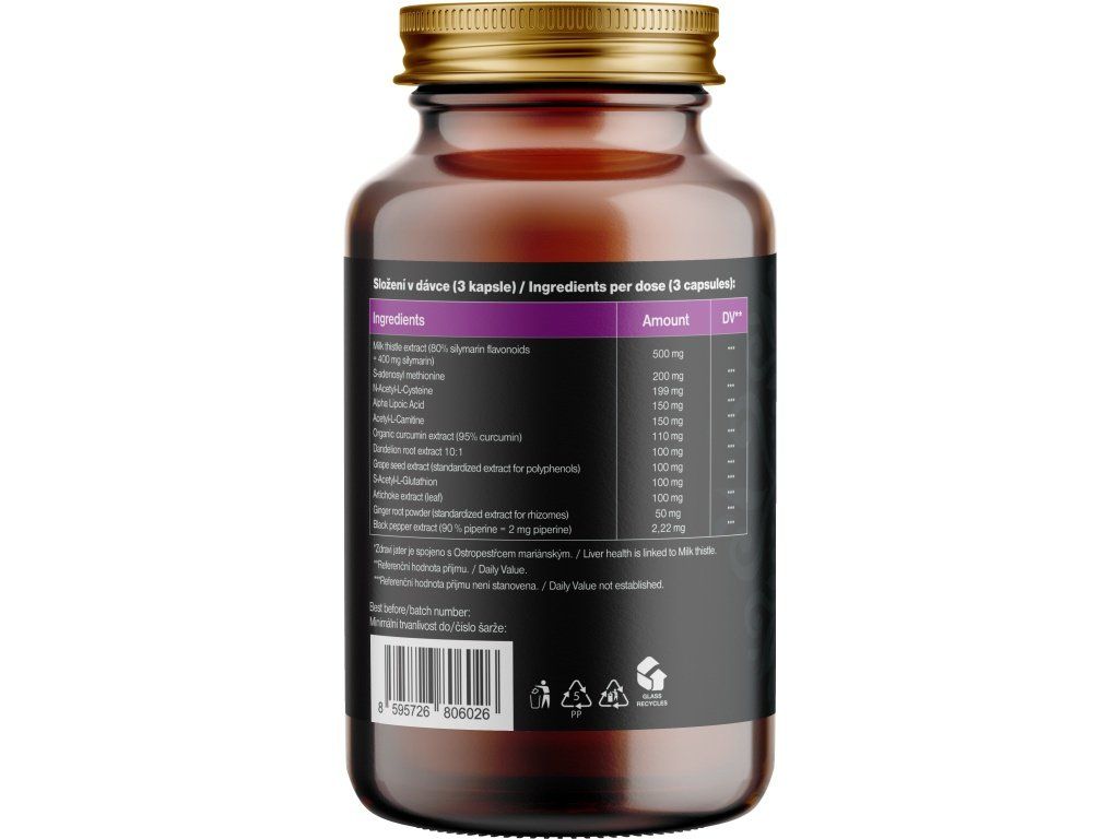 Sestava: Extrakt z ostropestřce mariánského (80 % silymarinových flavonoidov = 400 mg silymarinu), SAMe, N-Acetyl l-cystein, alfa lipoová kislina, acetyl L-Karnitin, BIO extrakt kurkuminu (95 % kurkuminu), extrakt z korenine regrata 10:1, ekstrakt iz grozdnih semen (standardiziran ekstrakt na polifenole), S-Acetyl-L-Glutathione, ekstrakt iz artičoke (list), prah iz korenine ingverja (standardiziran ekstrakt za korenike), ekstrakt iz črnega popra (90% piperina = 2 mg piperina), silicijev dioksid. Rastlinska kapsula na osnovi HPMC.
