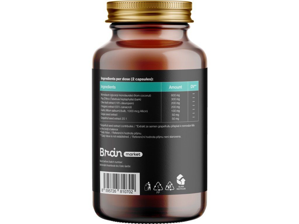 Sestava: Monolaurin (glyceryl monolaurát) (iz kokosa) (600 mg, ** NRV), Pau D'Arco (Tabebuia heptaphylla) (kora) (300 mg, ** NRV), ekstrakt iz oljčnih listov (18 % oleuropeina) (200 mg, ** NRV), ekstrakt origana (55 % karvakrola) (200 mg, ** NRV), česen (Allium sativum) (čebulica, 1000 mcg alicina) (100 mg, ** NRV), ekstrakt grozdnih semen (50 mg, ** NRV). Rastlinska kapsula na osnovi HPMC. Ne vsebuje nobenih dodatnih snovi (E-ji).