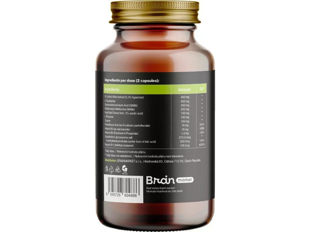 Sestava: Třezalka tečkovaná extrakt 0,3% hypericinu, L-Tryptofan, GABA, S-adenosyl-L-methionin (SAMe), extrakt z bazalky posvátné (min. 2% kyseliny ursolové), L-theanin, taurin, kyselina pantotenová (jako D-panthotenát vápenatý), vitamin B3 (nikotinamid), vitamín B6 (pyridoxal-5-fosfát), Quatrefolic® glukosaminová sůl - z toho 5-Methyltetrahydrofolát (aktivní forma kyseliny listové), vitamin B12. Rastlinska kapsula na bázi HPMC. Brez vsebnosti balastnih snovi.