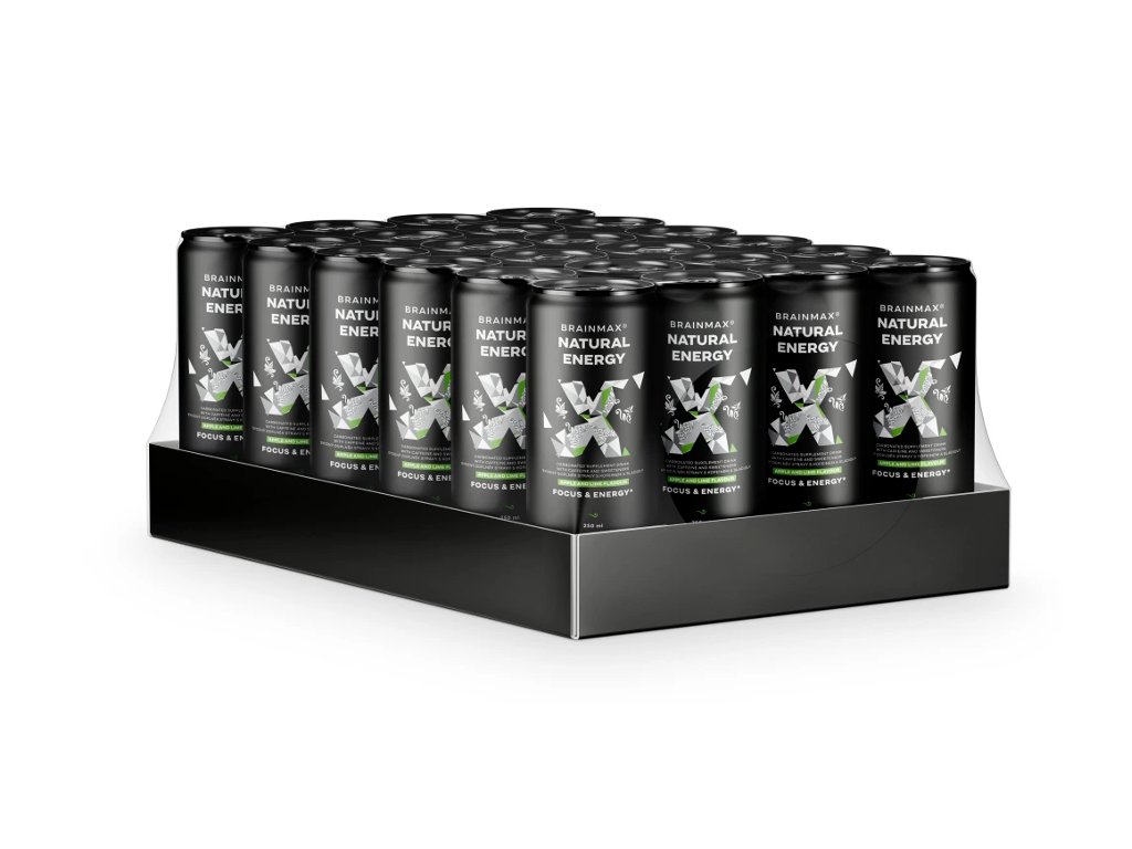 BrainMax Natural Energy, Jabolko in limeta, 24x250 ml Peneča energijska pijača, podpora duševni in telesni zmogljivosti, prehransko dopolnilo, 250 ml