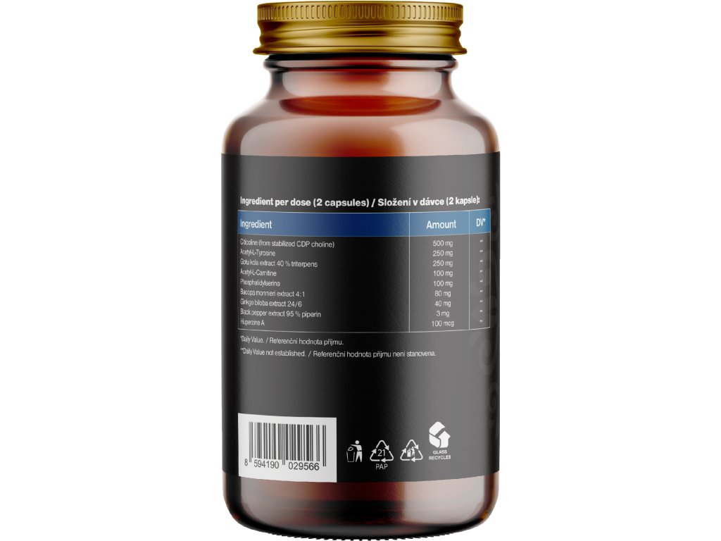 Sestavine: Citikolin (iz stabiliziranega CDP holina), Acetil-L-Tyrozin, izvleček gotu kole 40 % triterpenov, Acetil-L-Karnitin, Fosfatidilserin, izvleček Bacope monnieri 4:1, izvleček Ginka bilobe 24/6, izvleček črnega popra 95 % piperina,Huperzin A, magnezijev stearat. Rastlinsko. Kapsula na osnovi HPMC. Brez balastnih snovi. Izdelek je primeren tudi za vegane.