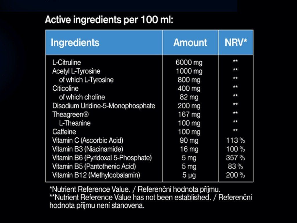 Sestavine na 100 ml: voda, L-citrulin (6000 mg, NRV **), acetil L-tirozin (1000 mg, NRV **), regulatorji kislosti (jabolčna kislina, fosforjeva kislina), citikolin (400 mg, NRV **) - od tega holin (82 mg, NRV **), arome, konzervans (kalijev sorbat), dinatrijev uridin-5-monofosfat (200 mg, NRV **), L-teanin (kot Theagreen®) (100 mg, NRV **), vitamin C (askorbinska kislina) (90 mg, NRV* 113 %), brezvodni kofein (100 mg, NRV **), sladila (acesulfam K, sukraloza, steviol glikozidi iz stevije), vitamin B3 (niacinamid) (16 mg, NRV* 100 %), vitamin B6 (piridoksal-5-fosfat) (5 mg, NRV* 357 %), Vitamin B5 (pantotenska kislina) (5 mg, NRV* 83 %), vitamin B12 (metilkobalamin) (5 µg, NRV* 200 %)