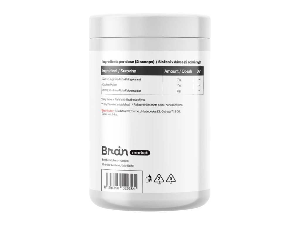 Sestava: L-arginin v obliki alfaketoglutarata, L-citrulin v obliki malata, L-ornitin v obliki alfaketoglutarata. Izdelek ne vsebuje nobenih balastnih snovi, vendar zaradi svoje higroskopične narave lahko slabo zaprt otrdi. To ne vpliva na učinkovitost. Dovolj je, da otrdelo mešanico npr. z žlico zdrobite in jo lahko nadalje brez težav uporabljate.