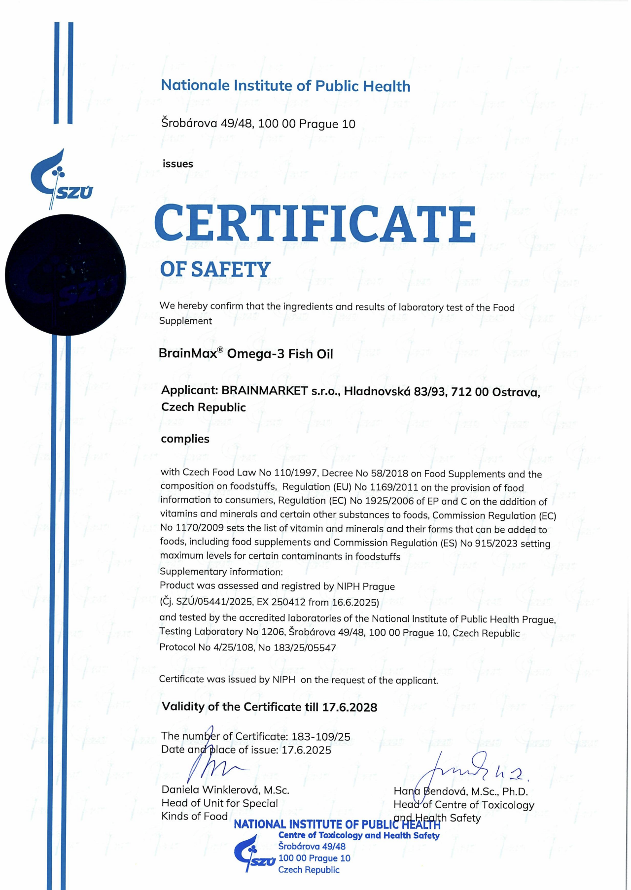 Ribje olje BrainMax Omega-3 je bilo testirano v akreditiranem laboratoriju. Izvedena je bila podrobna analiza sestave maščobnih kislin in svežine olja, vključno s parametri, kot sta peroksidno število in TOTOX. Izmerjena vrednost TOTOX je 10,2 vrednosti EPA pa 664 mg in DHA 433 mg. Izdelek je bil testiran tudi na mikrobiologijo, težke kovine in splošno varnost. Rezultate testov najdete tukaj.