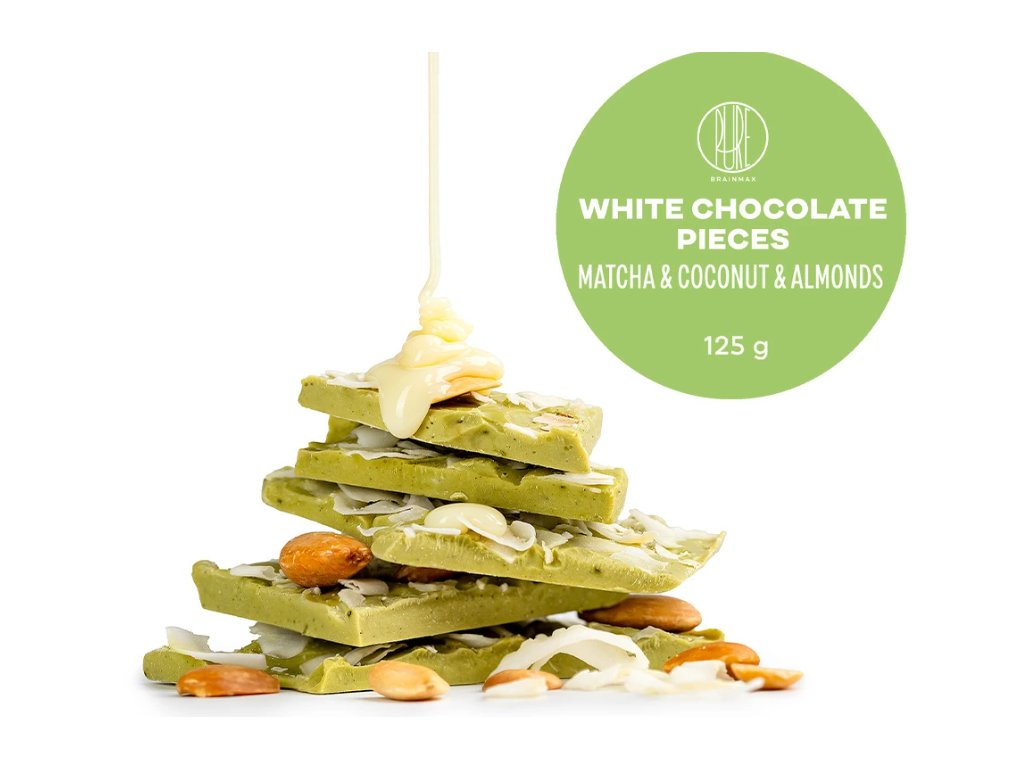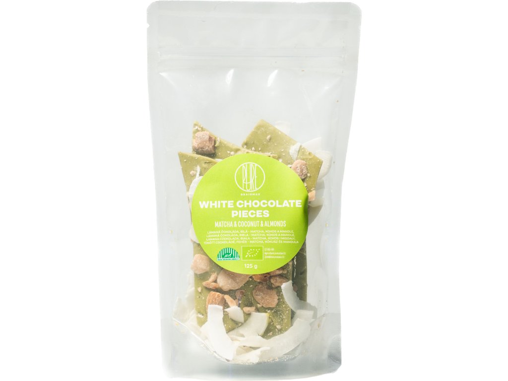 BrainMax Pure Broken bela čokolada - matcha, kokos in mandelj, BIO, 125 g *Certifikat CZ-BIO-001 / Koščki bele čokolade - Matcha, kokos in mandlji