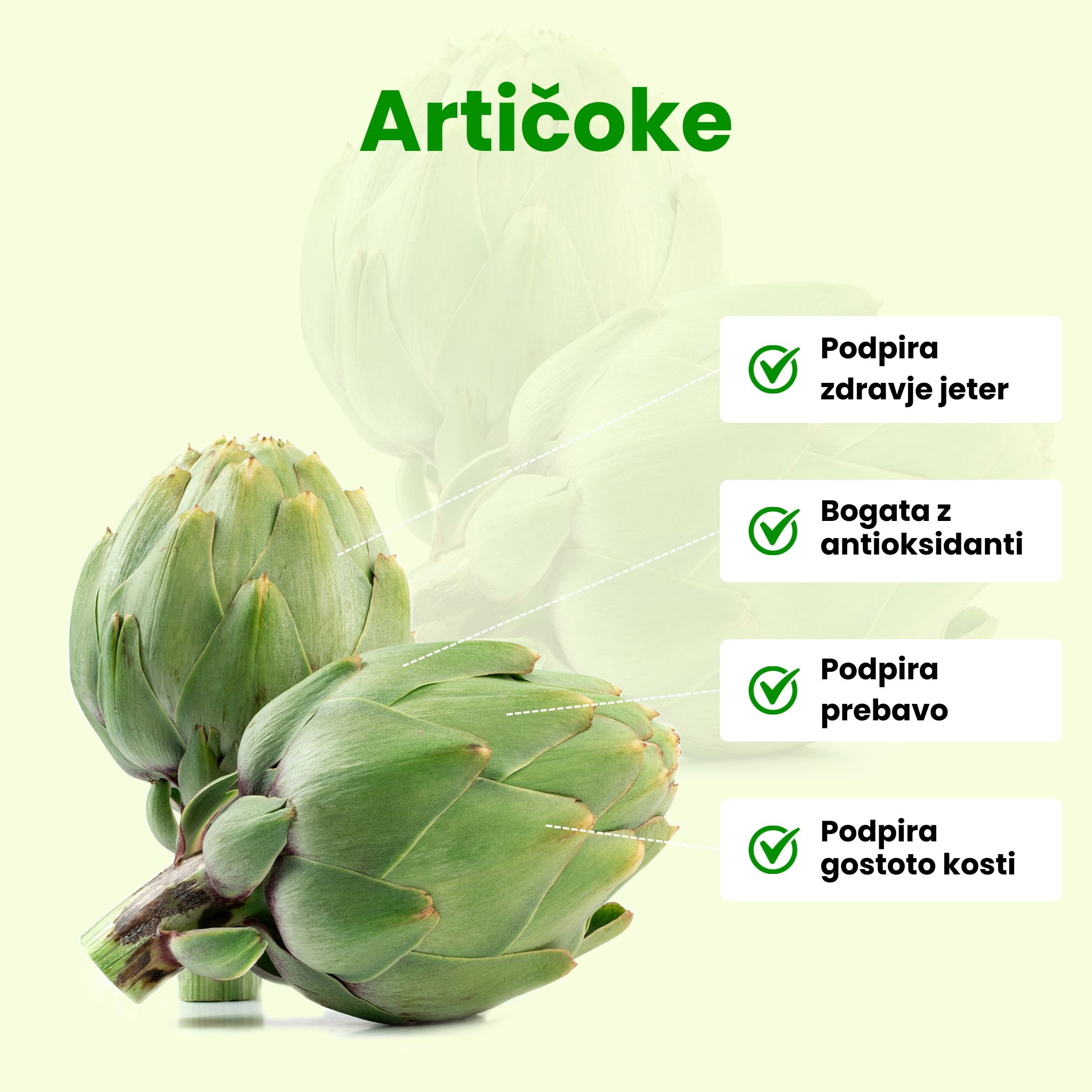 Artičoka je bogata s snovmi, ki podpirajo zdravje jeter, kot sta cinarin in klorogenska kislina. Zahvaljujoč temu artičoka podpira prebavo in razstrupljanje telesa. Izvleček artičoke vsebuje snovi, ki spodbujajo proizvodnjo žolča, kar lahko pomaga pri razgradnji težkih maščob in razstrupljanju jeter. Njegova bogata vsebnost antioksidantov pomaga zaščititi celice pred poškodbami prostih radikalov in tako podpira splošno zdravje in odpornost telesa.