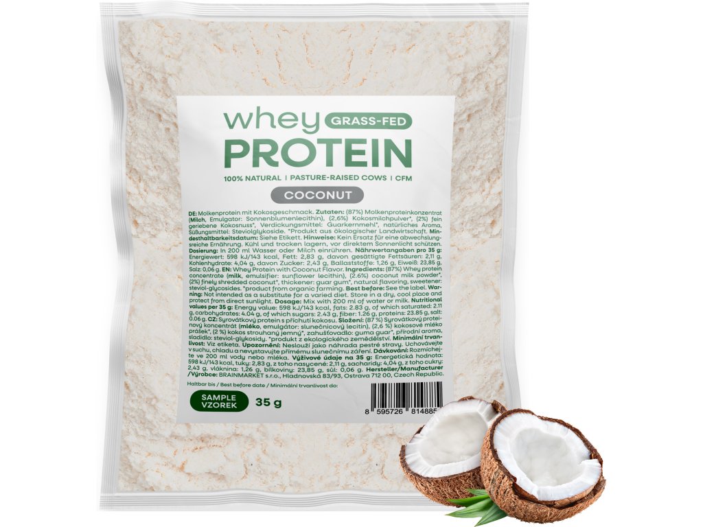 BrainMax sirotkine beljakovine, kokos, 35 g, VZOREC Mikrofiltrirane nedenaturirane beljakovine iz mleka krav, hranjenih s travo, prehransko dopolnilo