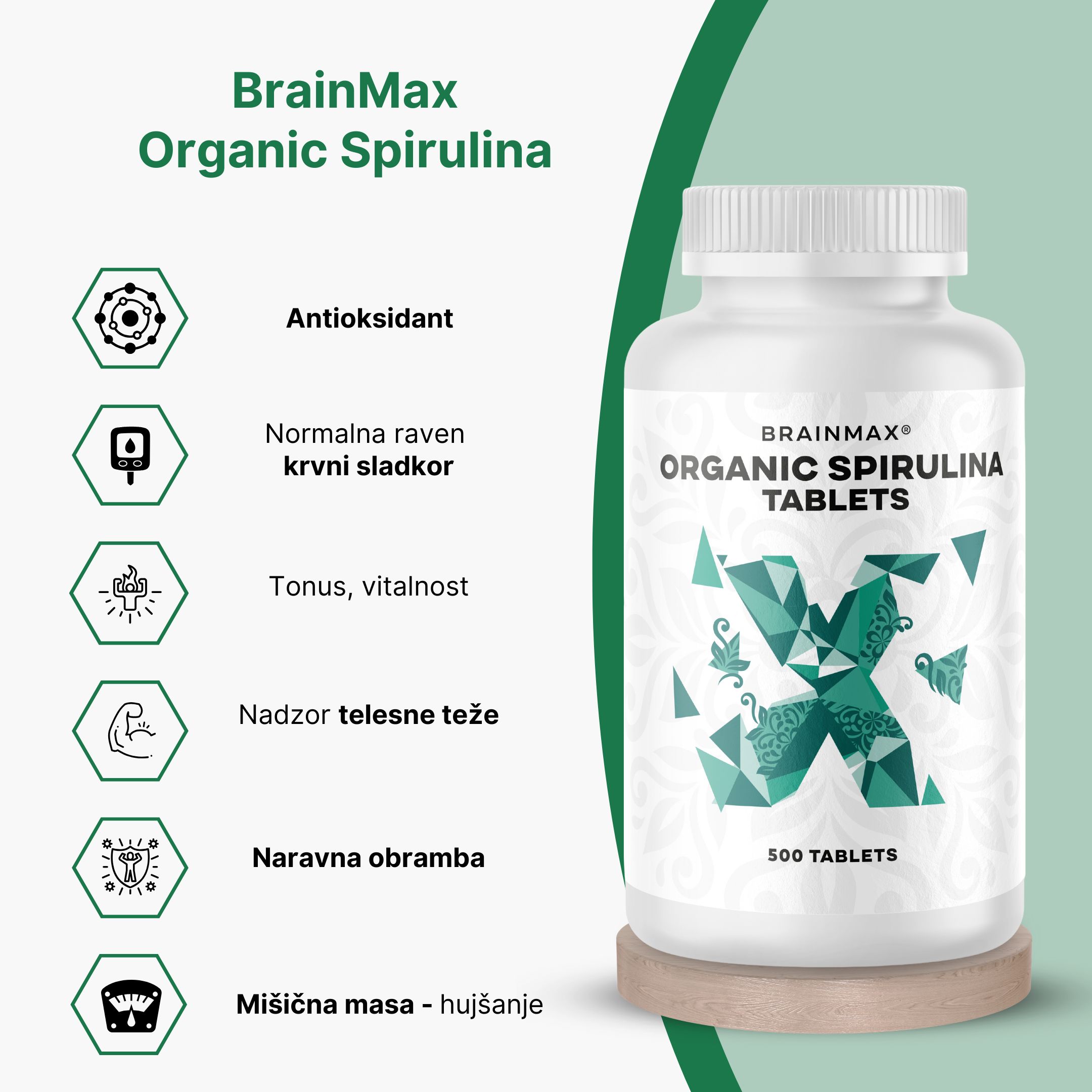 BrainMax Spirulina BIO, tablete Zelena superživila - antioksidant, imunost, vitalnost, mišična masa, prehransko dopolnilo, certifikat CZ-BIO-001