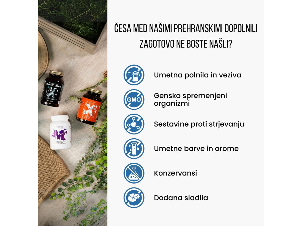 Opozorilo: Hraniti izven dosega otrok! Izdelek ni namenjen otrokom, nosečnicam in doječim ženskam. Ne prekoračite priporočenega dnevnega odmerka. Izdelek ni namenjen kot nadomestek za raznovrstno prehrano. Upoštevajte zdrav življenjski slog.