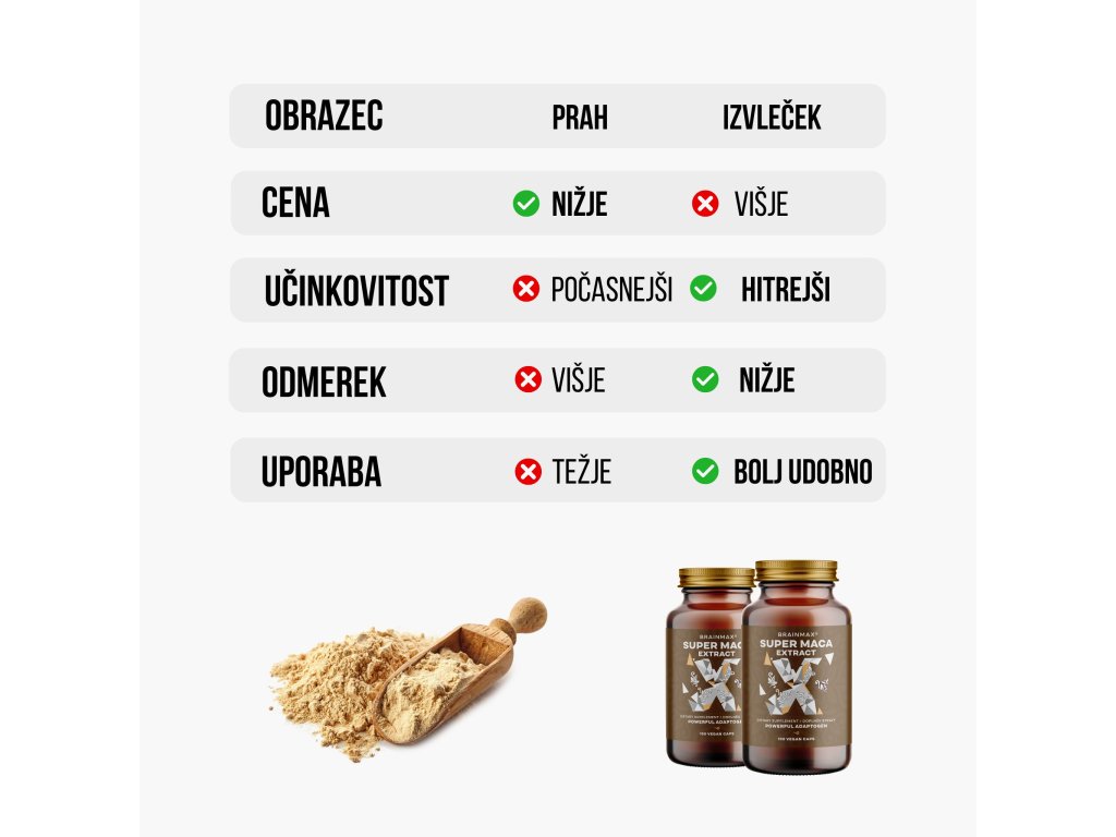 Maca vsebuje bioaktivne snovi, ki so odgovorne za vse njene učinke. Ekstrakti so v primerjavi s prahom iz korenine bolje absorbirani, saj pridejo v vaš krvni obtok hitreje in so veliko bolj koncentrirani, zato zadostuje precej manjša količina, da Maca začne delovati. Maca ekstrakt je tukaj v razmerju 6:1.