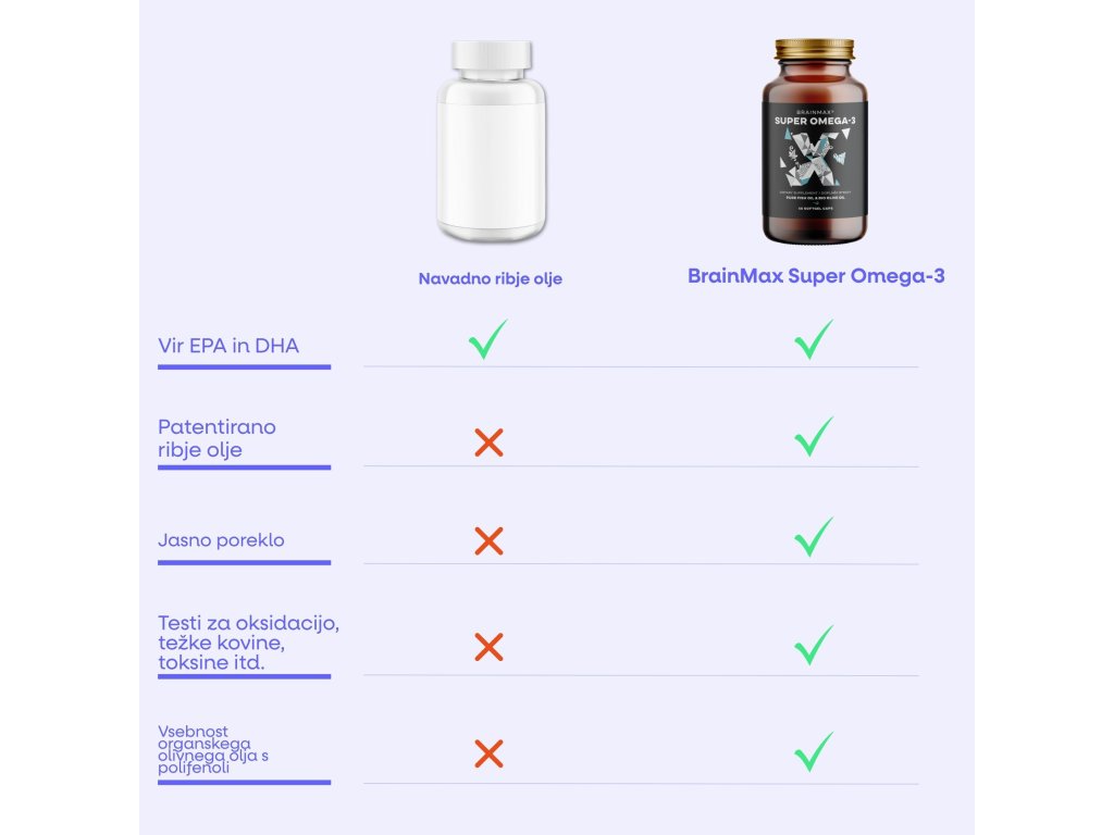 Omega-3 maščobne kisline DHA in EPA so pomembne za številne funkcije v telesu, vendar jih telo ne more proizvajati v zadostnih količinah. Redno uživanje ribjega olja je zato lahko koristno. Vendar je pomembno izbrati res kakovostno ribje olje, sicer ima lahko precej negativen učinek. Visokokakovostne omega-3 lahko podpirajo normalno delovanje možganov – DHA prispeva k njihovemu vzdrževanju . Hkrati DHA prispeva k ohranjanju normalnega vida , saj je naravni del očesne mrežnice. EPA in DHA prispevata tudi k normalnemu delovanju srca . Višji odmerki teh kislin lahko podpirajo tudi vzdrževanje normalne ravni trigliceridov in krvnega tlaka , kar je povezano z delovanjem srčno-žilnega sistema.*