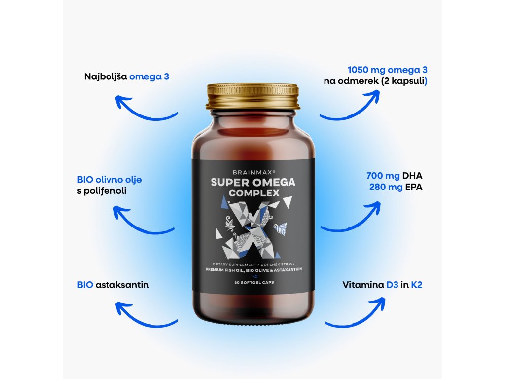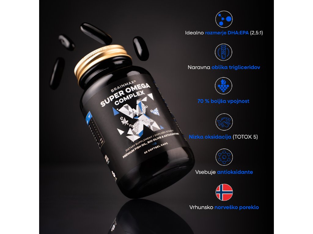 BrainMax Super Omega Complex, 60 mehkih kapsul Premium ribje olje z BIO astaksantinom in oljčnim oljem, vitamini D3&K2, 30 odmerkov, prehransko dopolnilo