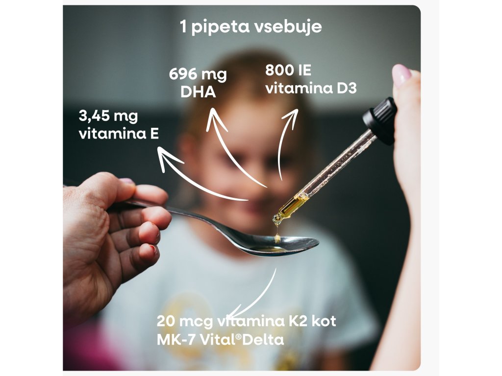 Vitamina D3 in K2 sta topna v maščobah in rastlinskega izvora. Vitamin D3 se pridobiva iz bora, vitamin K2 norveškega podjetja Kappa Bioscience pa iz muškatnega oreščka. Skupaj z omega-3 maščobnimi kislinami zagotavljajo pravilno odlaganje kalcija v kosteh, močno imunost ter zdrave kosti in zobe. Glede na študije je vitamin K2 Vital Delta najučinkovitejši vitamin K2 na trgu, zahvaljujoč tehnologiji enkapsulacije, ki zagotavlja izjemno stabilnost. Vitamin D3 je pomemben za otroke, saj podpira zdravo rast kosti in zob, optimizira delovanje imunskega sistema in uravnava raven kalcija v telesu.