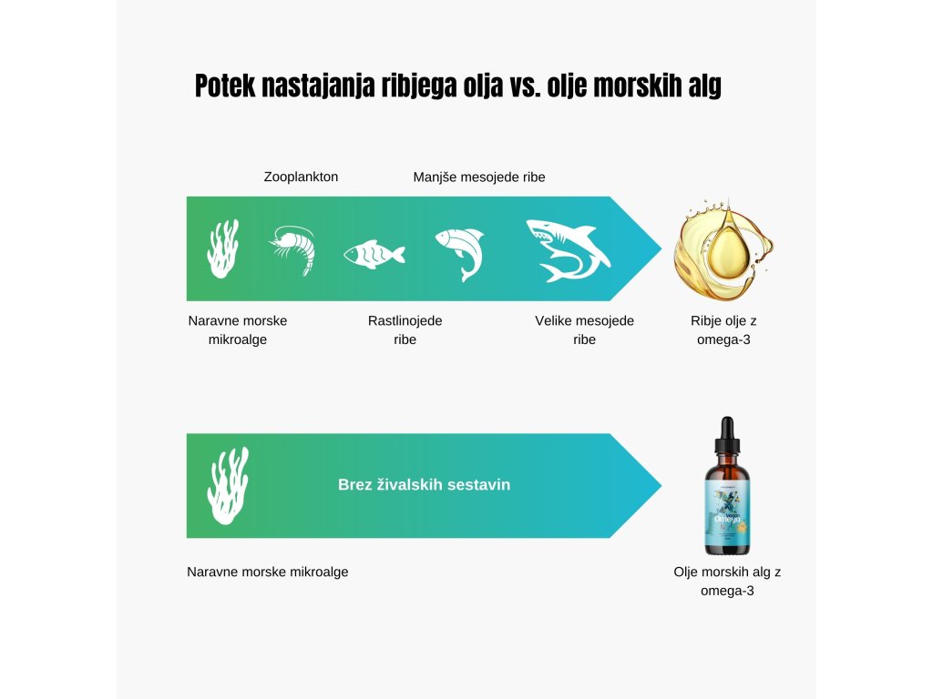 Pozabite na semena – iz njih ne boste dobili učinkovitega DHA. Olje iz alg ALGAE je čisti rastlinski vir omega- 3 (DHA in EPA), pridelan brez toksinov ali težkih kovin. Za razliko od ALA iz chia semen ali oreščkov, ki se skoraj nikoli ne pretvori, so alge naraven in trajnosten vir, ki ponuja odlično absorpcijo zaradi fosfolipidov in poleg tega klorofila za razstrupljanje jeter.