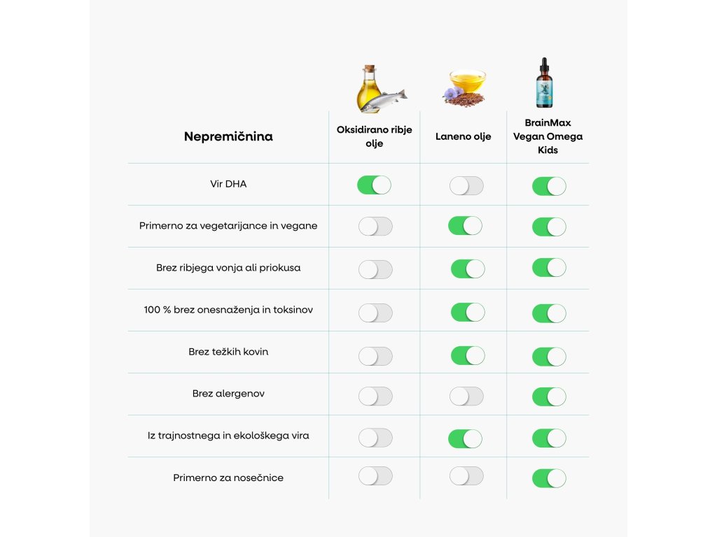 Če iščete prehransko dopolnilo za svojega otroka, so omega-3 maščobne kisline ključne. BrainMax Vegan Omega KIDS vsebuje vse, kar je potrebno za zdrav razvoj otrok. Za razliko od različice za odrasle ima otroška različica manj olivnega olja, zaradi česar je olje blažjega okusa. Zaradi tega je to olje prijetno za uporabo otrokom, odmerjanje s pipeto pa olajša dajanje.