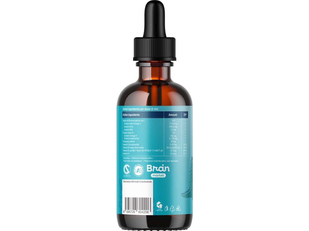 Sestava: Olje alg (Schizochytrium sp.), organsko olivno olje, vitamin E (tokoferoli), veganski vitamin D3 (iz bora), vitamin K2 kot MK-7 (iz olja K2 VITAL® 1% MCT), izvleček rožmarina, aroma limone in limete. Brez balastnih snovi.