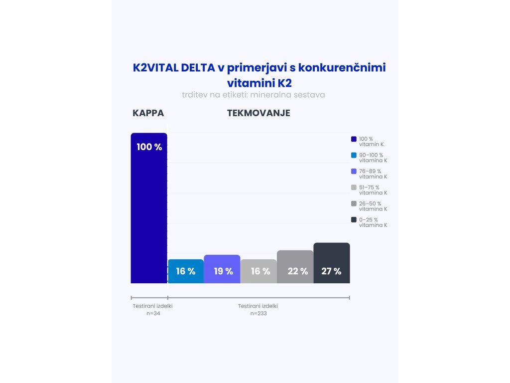 Podjetje Kappa je izvedlo tudi raziskavo kakovosti, stabilnosti in učinkovitosti vitamina K2 v prehranskih dopolnilih v kombinacijah brez mineralov, kjer stabilnost ne bi smela biti problem. Polovica teh nemineralnih izdelkov z vitaminom K2 je imela težave s kakovostjo, pri čemer celotna tretjina vzorca ni kazala nobene merljive vsebnosti Vitamina K2 (nič). Pri petini izdelkov je bila izmerjena vsebnost vitamina K2 v razponu 26–75% v primerjavi z deklarirano količino na etiketi. Le pri četrtini izdelkov je izmerjena količina vitamina K2 ustrezala količini na etiketi.