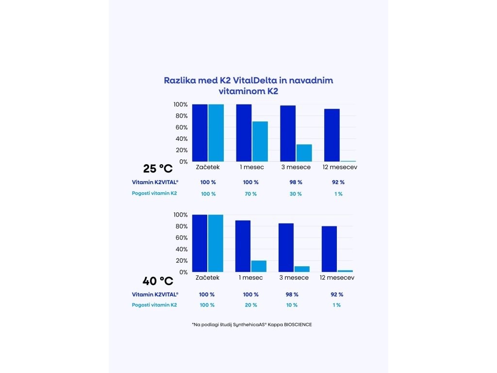 K2VITAL®DELTA MK7 je v primerjavi z drugimi običajnimi vitamini K2 precej bolj stabilen pri običajnih in višjih temperaturah, in tudi po več mesecih ne podleže tako hitro biodegradaciji kot druge oblike vitamina K2.