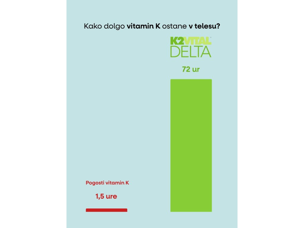 Vitamin K2 v obliki MK-7 all-trans je bolj stabilen kot običajne oblike vitamina K in se v telesu zadrži bistveno dlje – do 72 ur v primerjavi z 1,5 uro pri drugih oblikah. Zaradi tega je idealen za enkratno dnevno odmerjanje. Patentirana oblika K2VITAL®DELTA je poleg tega zaščitena z dvojno enkapsulacijo, ki zagotavlja njeno stabilnost med proizvodnjo in v prebavnem traktu.