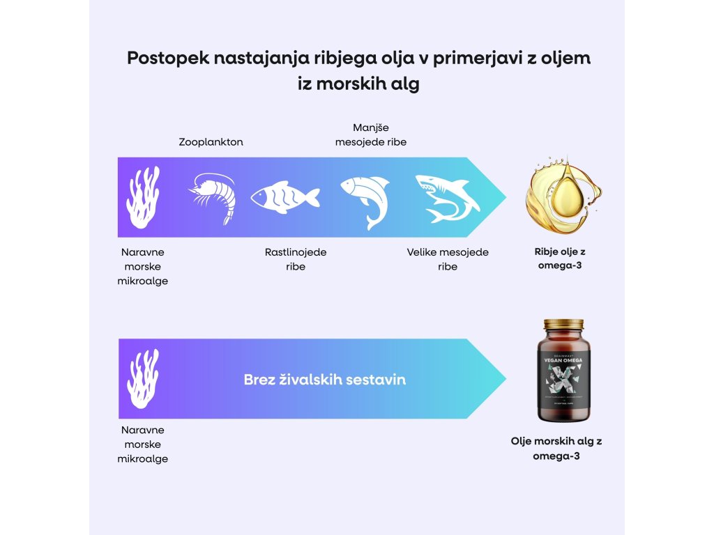 Čeprav lahko omega-3 maščobne kisline dobimo tudi na primer iz chia semen ali lanenih semen, je pretvorba ALA v DHA in EPA iz teh rastlinskih virov pogosto pod 10 % ali manj. Olje alg vsebuje omega-3 maščobne kisline v obliki, ki jo telo lahko enostavno in učinkovito uporabi. Zato je bolje izbrati morske alge, ki tvorijo bistveno osnovo prehranjevalne verige. Prav zaradi alg so ribe bogate z omega-3 maščobnimi kislinami. Poleg tega so alge trajnosten in predvsem primarni vir omega-3 maščobnih kislin, kar znatno zmanjša tveganje za kontaminacijo s težkimi kovinami, toksini in mikroplastiko. Vsebujejo tudi naravno prisotne fosfolipide, zaradi katerih se maščobne kisline odlično absorbirajo. Alge vsebujejo klorofil, snov, ki prispeva k nastanku hemoglobina.