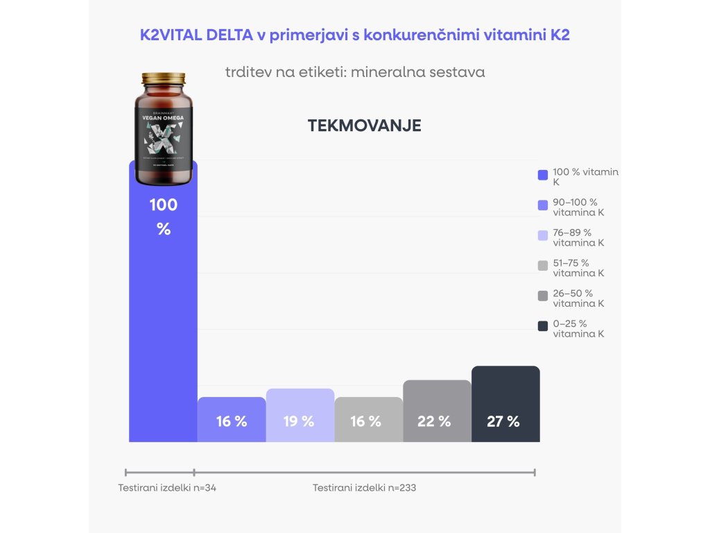 Vitamin K2 smo uporabili kot MK-7, patentirano obliko norveške blagovne znamke K2VITAL®DELTA. To je najbolj absorbirajoča oblika vitamina K2. Od vseh vitaminov K ima najdaljši razpolovni čas, kar pomeni, da v telesu ostane do 72 ur! Zaščiten je s sferično lupino in je zato dovolj zaščiten tako med proizvodnjo kot v prebavilih. To mu pomaga ohranjati visoko stabilnost tudi pri visokih temperaturah. Vitamin K prispeva k normalnemu strjevanju krvi in ohranjanju normalnega zdravja kosti.