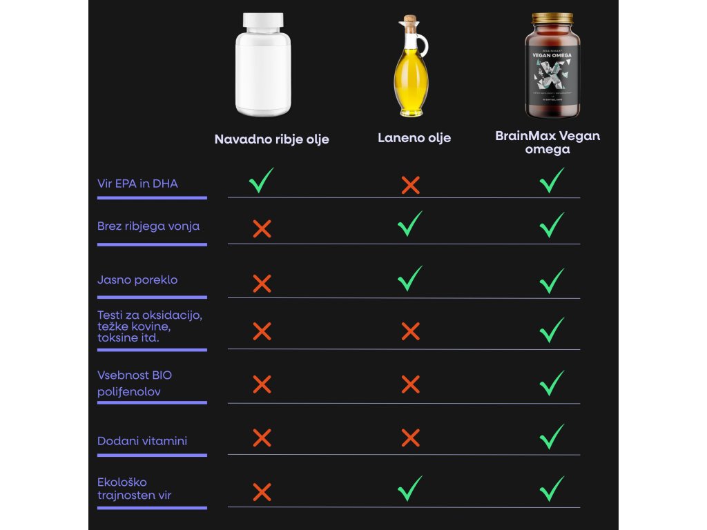 BrainMax Vegan Omega združuje najčistejši vir omega-3 maščobnih kislin iz alg Schizochytrium s premium organskim olivnim oljem z antioksidativnim delovanjem in patentirano vegansko vitaminsko matrico D3 in K2. S skoraj 800 mg DHA in EPA v enem odmerku je to prehransko dopolnilo idealen način za dopolnitev najbolj naravnih omega-3 maščobnih kislin. Algovo olje zagotavlja maksimalno čistost brez onesnaževalcev, značilnih za morske ribe. Učinkovito podpira zdravje možganov, srca in vida.