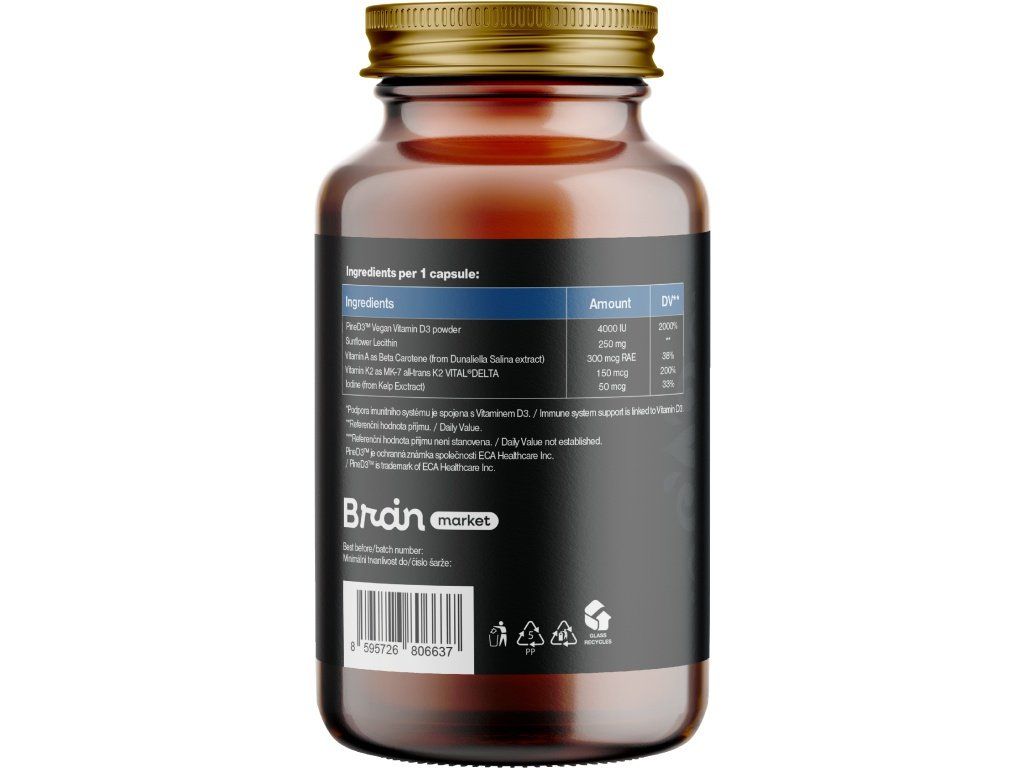 Sestava: PineD3™ Veganski vitamin D3 v prahu, sončnični lecitin, vitamin A kot beta-karoten (iz ekstrakta Dunaliella Salina), vitamin K2 kot MK-7 all-trans K2 VITAL®DELTA, jod (iz BIO alg). Rastlinska kapsula na osnovi HPMC. Brez vsebnosti balastnih snovi.