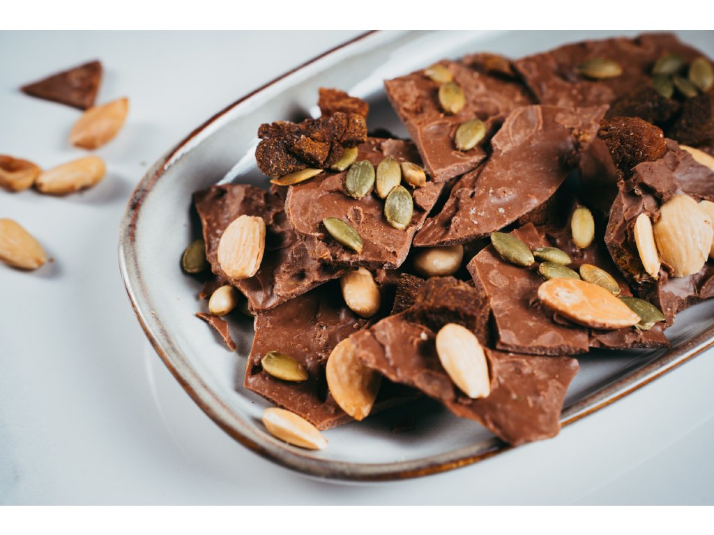 Mandlji in bučna semena: Fino hrustljavi mandlji in bučna semena obogatijo čokolado z nežnim okusom po oreščkih in poskrbijo za prijetno teksturo.