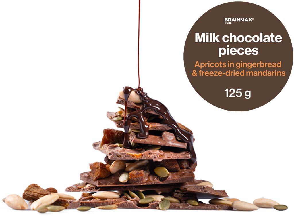 BrainMax Pure Lomljena mlečna čokolada, marelice v medenjaku in liofilizirane mandarine, 125 g *Certifikat CZ-BIO-001