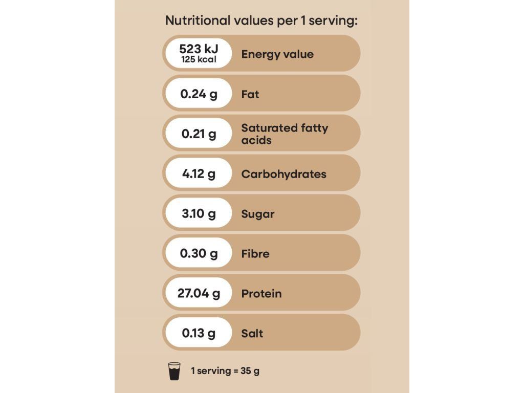 Prijetno sladkast okus proteinu je pripomoglo listje stevije – zelišča, ki je do 300× slajše od sladkorja in ne vsebuje nobenih kalorij. Za bolj kremasto konsistenco smo uporabili semena guarovih plodov, ki naravno vsebujejo vlaknine.