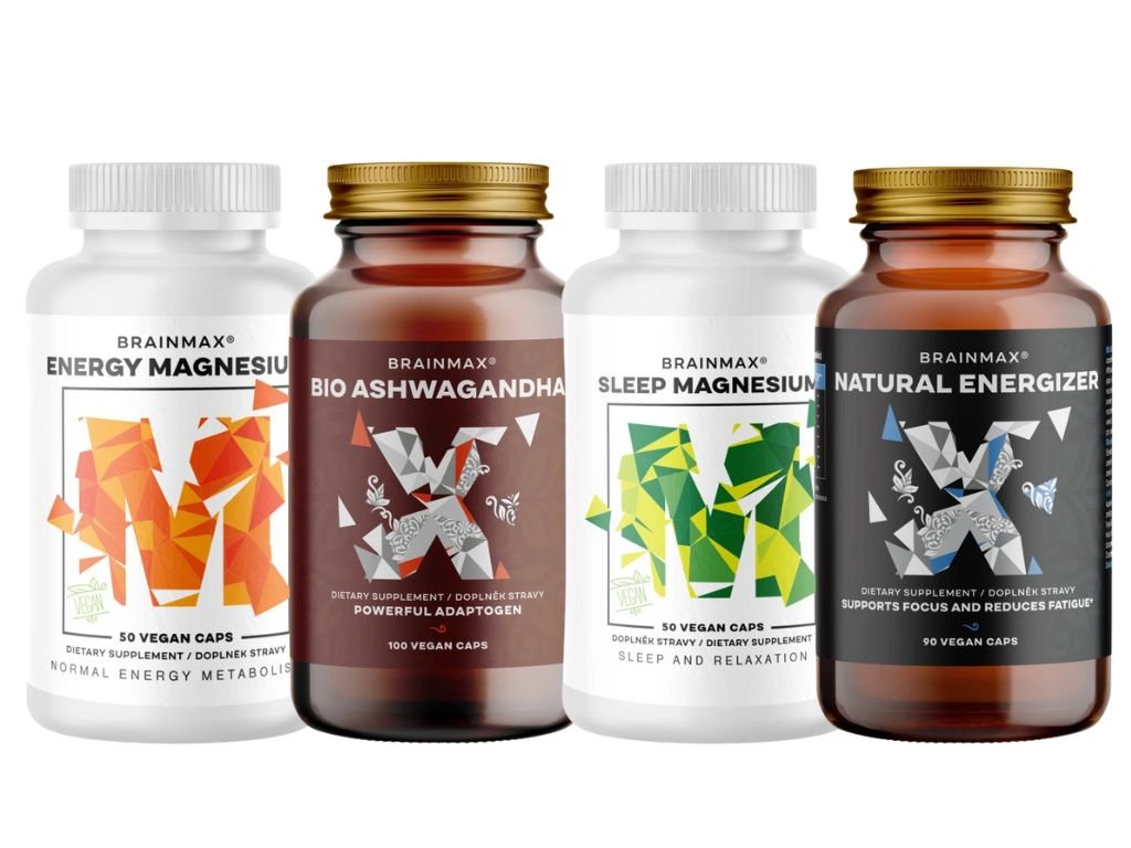 Zjutraj - 2 kapsuli BrainMax Energy magnezija. Popoldne - 3 kapsule BrainMax BrainMax Natural Energizer kapsule: Ne priporočamo kombiniranja z drugimi viri kofeina. Prekomerni odmerki kofeina lahko povzročijo slab spanec, živčnost, tresenje in raztresenost. Zvečer morda sploh ne boste zaspali. Zvečer - 1 kapsula BrainMax Ashwagandha. Če imate težave s ščitnico, priporočamo, da se najprej posvetujete z zdravnikom, ali je ašvaganda primerna za vas. 30 minut pred spanjem - 2 kapsuli BrainMax Sleep magnezija