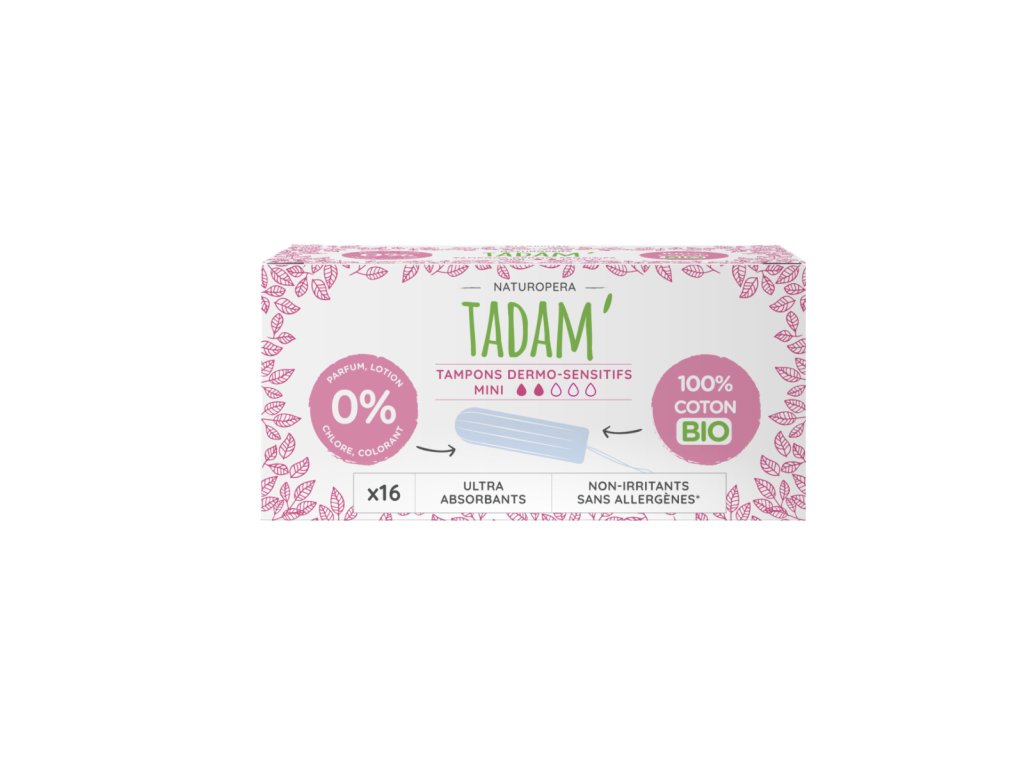 Tamponi TADAM Dermo Sensitiv Mini so zasnovani za ženske, ki imajo raje ekološko in nežno alternativo klasičnim tamponom. Izdelani so iz certificiranega organskega bombaža in celuloze iz trajnostnih virov. Njihova gladka površina in visoka vpojnost zagotavljata udobje in zanesljivost med lažjimi menstruacijami. Tamponi ne vsebujejo dišav, klora ali barvil, zaradi česar so idealna izbira za občutljivo kožo. So nežni ne le do telesa, temveč tudi do okolja, in imajo certifikat Swan and Cellulose TFC.