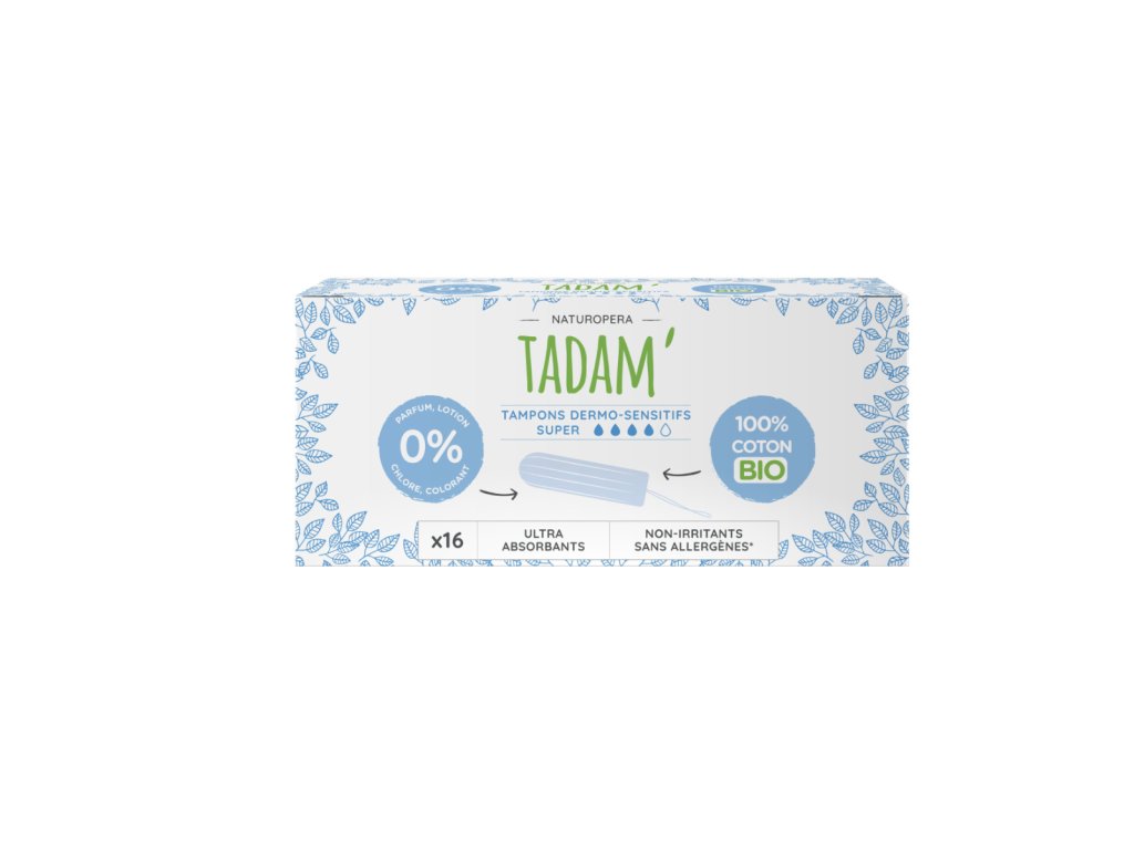 Tamponi TADAM Dermo Sensitiv Super so zasnovani za ženske, ki imajo raje ekološko in nežno alternativo klasičnim tamponom. Izdelani so iz certificiranega organskega bombaža in celuloze iz trajnostnih virov. Njihova gladka površina in zelo visoka vpojnost zagotavljata udobje in zanesljivost med menstruacijo. Tamponi ne vsebujejo dišav, klora ali barvil, zaradi česar so idealna izbira za občutljivo kožo. So nežni ne le do telesa, temveč tudi do okolja, in imajo certifikat Swan and Cellulose TFC.